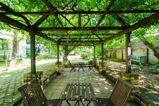洋館をリノベーションした文化庁登録有形文化財「大泉家住宅洋館」。隣には同じく文化財の和館や、バラやアジサイなど四季に沿った花々を堪能できるオープンガーデンがあります。自社敷地内の「1110 CAFE/BAKERY」や、フリーアドレスルーム、 WAREHOUSE、会議室、Blest room、Reflesh Roomなど、働きやすい環境が整っています。